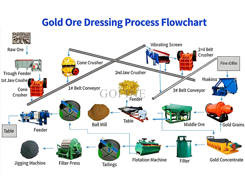 A gold ore beneficiation production line is a complete industrial process that transforms gold-bearing ore into high-grade gold concentrate (or finished gold product). Its core components are crushing, grinding, beneficiation, and purification. Mainstream processes include gravity separation, flotation, cyanidation (CIP/CIL), and combined processes, adaptable to different types of gold ores.