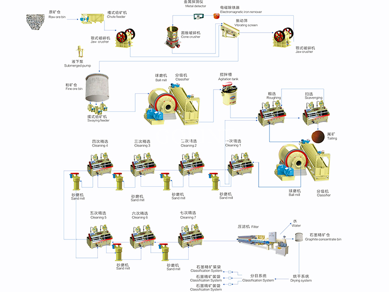 Graphite beneficiation utilizes graphite’s natural hydrophobicity and floatability, employing flotation to separate graphite from gangue minerals. For the characteristics of flake graphite, we use a multi-stage grinding-multi-stage beneficiation process: